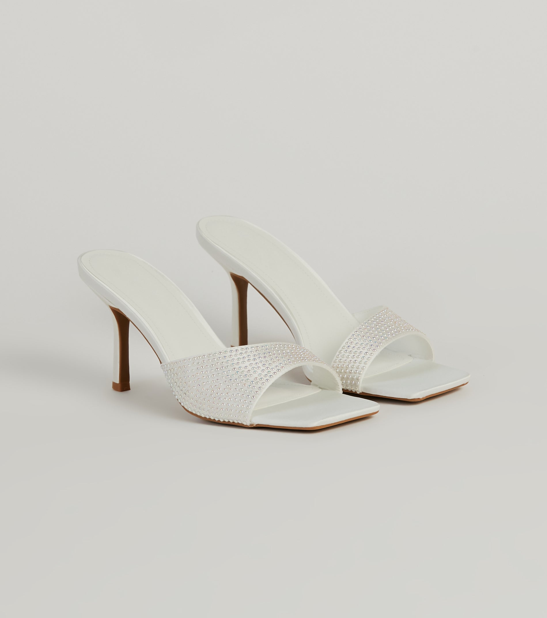 Make a chic first impression in these elevated stiletto mules! They feature an open square-shaped toe. an asymmetric foot strap with a mini iridescent studded design. a short stiletto heel. a sleek satin material. and a slightly cushioned faux leather insole. Style with a classic clutch.