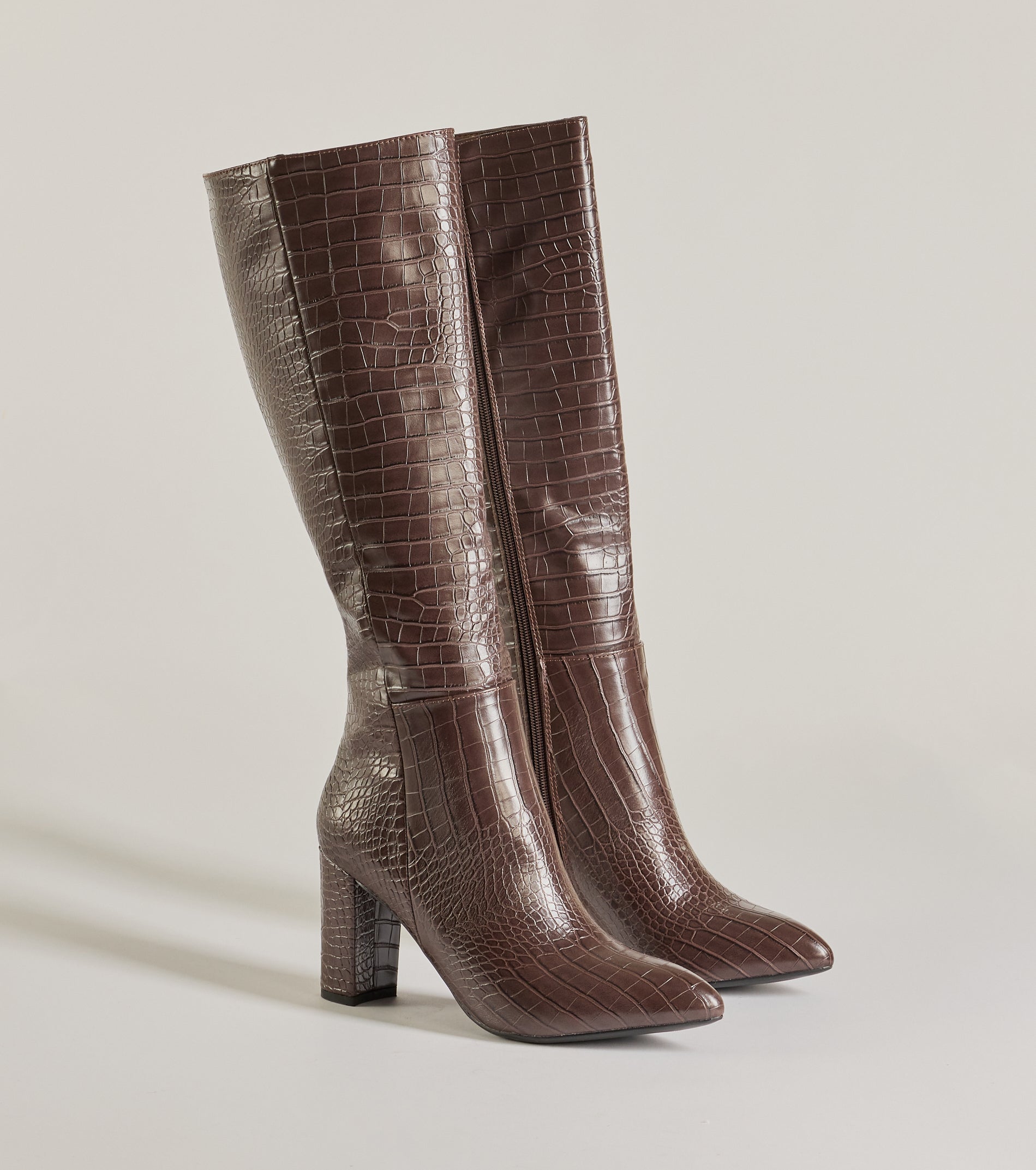 Create a chic moment with under-the-knee boots that bring the drama! The faux leather boots feature a trendy faux croc-embossed pattern. pointy toe. an inner zipper closure. and a sturdy block heel. Complete look with a sweater dress!
