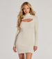 Comfy meets chic in this adorable ribbed knit mini dress featuring a mock neckline. long fitted sleeves. a bold cutout above the bust. and a short bodycon silhouette. Style with knee-high boots.