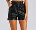 Stun with shorts that are anything but basic! The shorts feature a high-rise paper bag waist. slant pockets. and a rolled hem. The shorts are composed of a faux leather fabric that offers a form hugging fit with a moderate stretch. Complete look with a bustier.Â