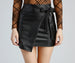The perfect chic wrap to add style to your look. This mini skirt features a high-rise waist. envelope side tie. composed of faux leather fabric with a moderate stretch. Complete the look with peep-toe booties.