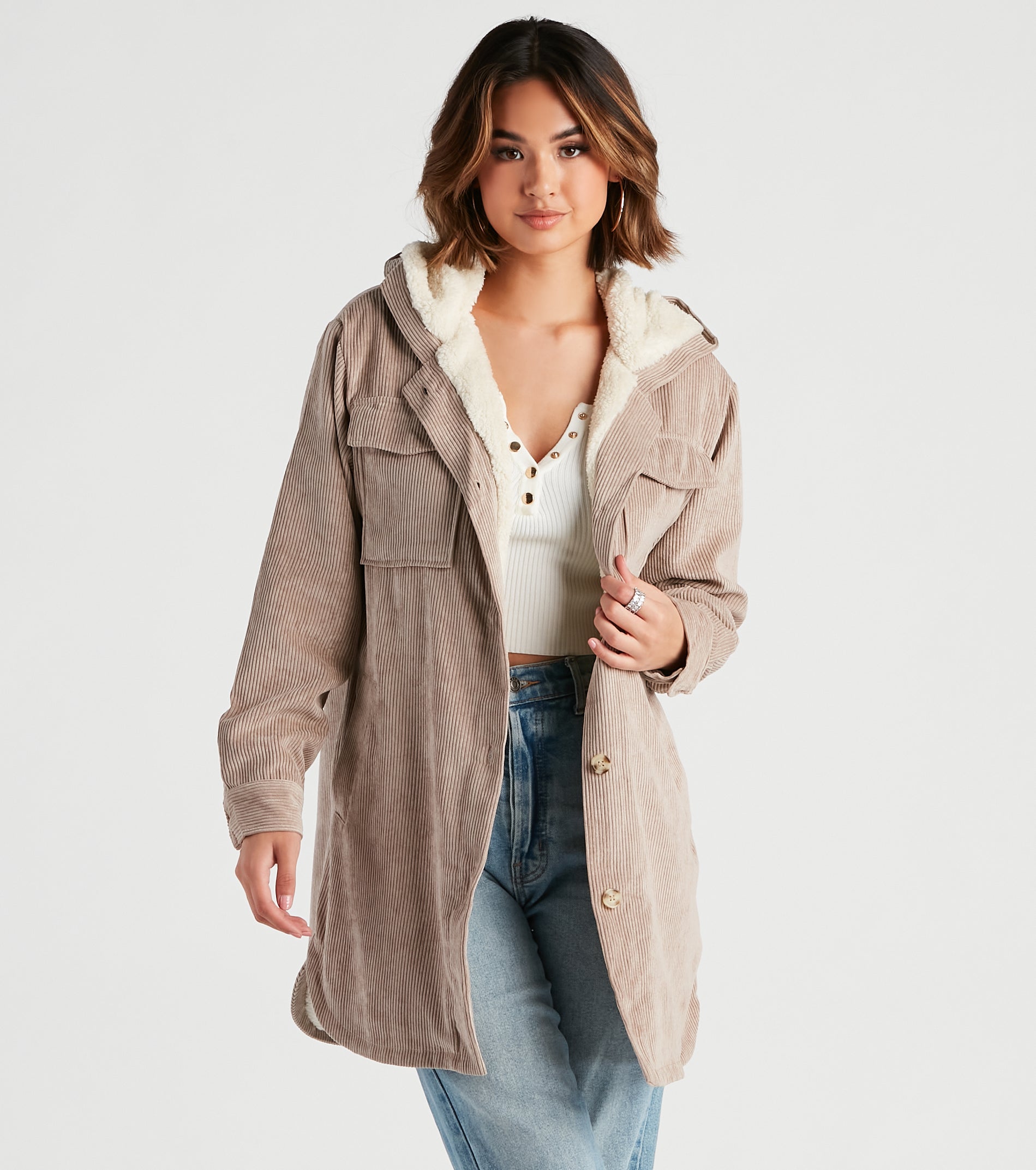 This tale is as chill as time! The corduroy shacket offers a cozy and cute look to bundle up in this season. It features long sleeves. button cuffs. a hooded neckline. four-pocket styling. a button-down front. and a longline hem with faux sherpa lining. Complete the look in knee-high boots.