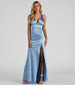Designed in luxe shiny satin. the Cindy formal dress is an absolute stunner for your next dressy event! She features a sultry. sleeveless V-neck halter atop a banded empire waistline that leads to her long-length hem with a front slit. Her open-back showcases plenty of skin with sleek bungee spaghetti straps that create a head-turning moment. The formal dress is composed of a satin-lined fabric with a minimal stretch and zipper closure. Complete the look in statement heels and jewelry.