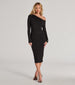 Classic and sleek. this stretchy knit midi dress features an asymmetric off-shoulder neckline with long fitted sleeves. ruching at the waist to accentuate your curves. and a bodycon silhouette. Style with stiletto heels for a chic outing!