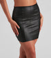Amp up your night-out looks with this classic and sleek faux leather mini skirt. It features a high-rise waist. vertical seam detailing down the front. and a short. curve-hugging. bodycon silhouette. Style this skirt with strappy stilettos.
