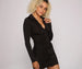 Button up in a chic mini dress that is oh so chic! The dress features a collared neckline. a button-down front. long sleeves. a ruched body. and a mini-length silhouette. The dress is composed of a smooth knit fabric that offers a form-hugging fit with a moderate stretch. Complete look with heels.Â