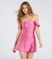 This satin mini dress will be your favorite for celebrations. events. and date nights! Sleek and smooth satin shapes this off-the-shoulder dress. which features a flattering A-line silhouette perfect for styling with heels.