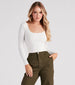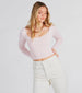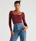This minimalistic basic top is what every girl needs for everyday styling! The crop top features long fitted sleeves. and a scoop neck. and is composed of a buttery soft knit fabric with a seamless design. Complete the look in a cute jean jacket. paper bag pants. and booties!