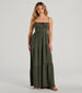 A dreamy sleeveless maxi dress perfect for styling for beach city days or coastal vacations! The scoop neckline and bust tie accentuate your figure. while adjustable spaghetti straps provide the perfect fit. The lace-up back adds a touch of charm. while the flowy ruffled silhouette and maxi-length hem exude effortless chicness! Complete the look with strappy sandals and sunglasses.