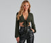 You'll have lots of fun styling this tie-front top featuring puff long sleeves. a collared plunge neckline. and a self-tie cropped hem. Composed of a smooth knit fabric offering a moderate stretch. Complete the look with dangly earrings and jeans.