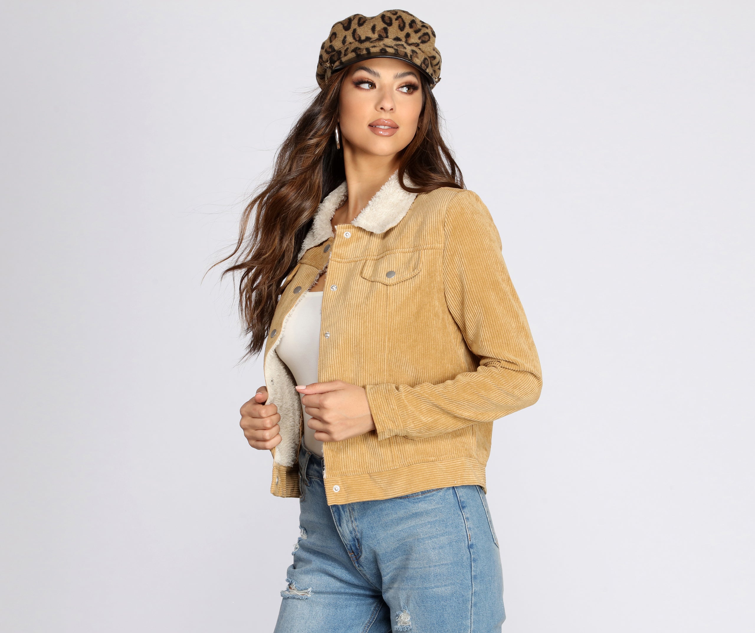 Mix and match with textures! This corduroy jacket is a season must have! Designed with a sherpa lining. long sleeves. a collared neckline. and smooth metal button closures down the center. Jacket features faux breast pockets. and a hem that hits just passed the waist line. Composed of a faux fur lining and a cordoroy outer offering no stretch and a form fit.