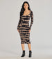 The ribbed knit dress features a scoop neckline. fitted long sleeves. a tie-dye pattern. and a midi-length hem accented with a center slit at the hem. Complete the look with ankle booties for a casually chic vibe.Â