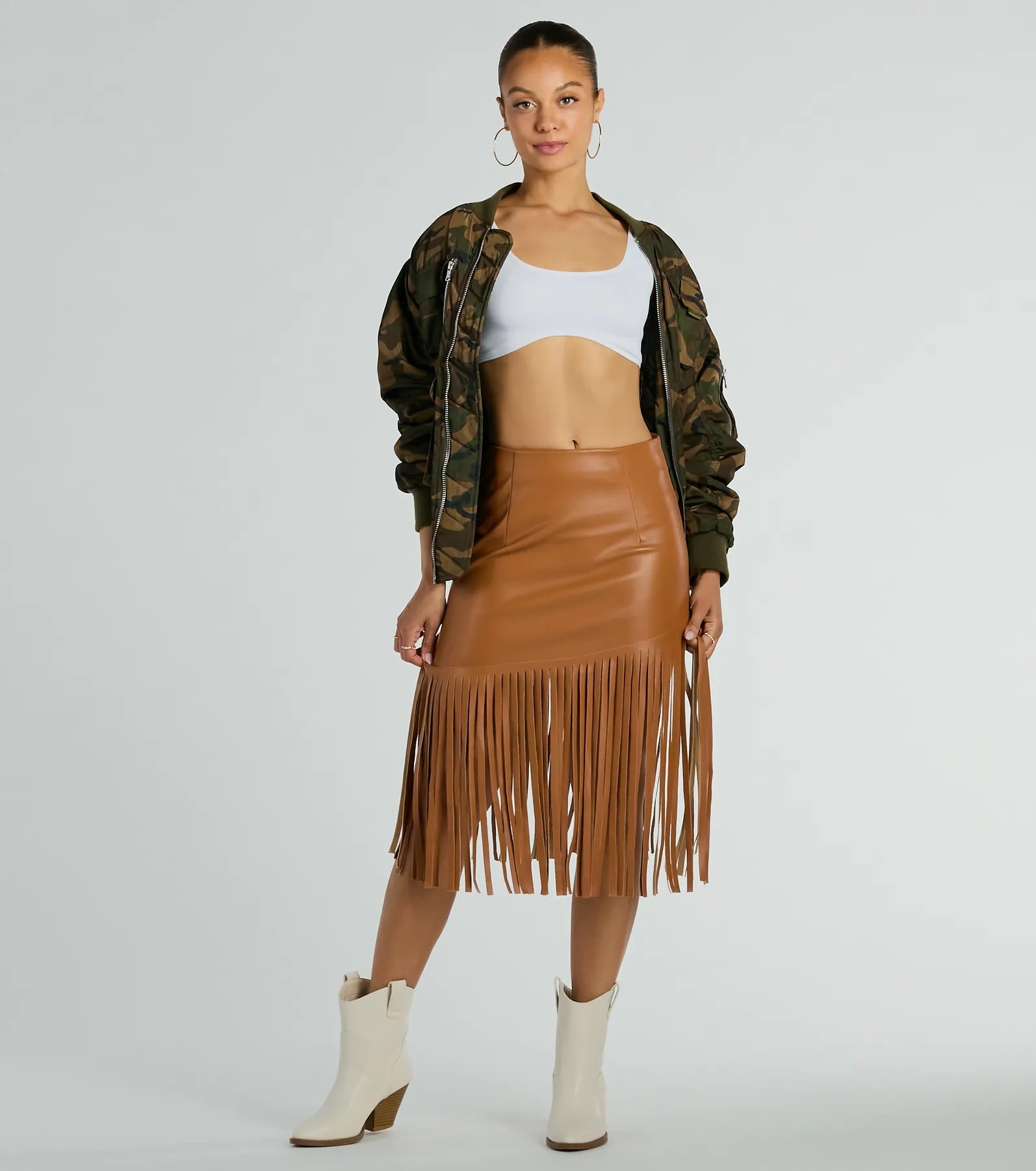 Sway to the beat of your favorite country songs in this faux leather midi skirt at festivals and concerts! The midi skirt boasts a flattering high-rise waist. bodycon fit. and eye-catching long fringe perfect for dancing. Complete the look with a cowboy hat.