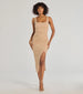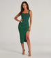 Get ready to strike a pose in the dazzling Courtney formal glitter dress at rehearsal dinners. weddings. or dressy birthdays! She features a sleeveless square neckline. tank shoulder straps. a form-hugging silhouette. and a side pleated seam that creates the chic wrap hem with a flirty slit. The formal dress is composed of a crepe glitter knit fabric with a moderate stretch. Complete the look with statement fringe earrings.