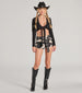 Show up and strut in style at your Halloween party as a cowgirl outlaw in these hot shorts! Designed with a cow print on brushed knit fabric. they feature a high-rise elasticized waist and a cheeky form-hugging fit. Complete your costume with the tie-front crop top. cowboy hat. and a sleek pair of western boots!