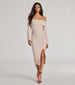 Show off a luxe look while still keeping it cozy in this soft cable knit midi dress is designed with an off-the-shoulder fold-over neckline. long fitted sleeves. and a high front slit to accent the midi-length form-hugging silhouette. Style with knee-high boots or strappy heels!