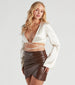 You'll be the chicest thing on the menu! Serve up major looks in this satin crop top featuring long bell sleeves. a plunge-open neckline. and a wrap-tie string that lets you customize the style. Complete your outfit in a mini skirt for dinner and drinks!
