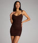 Flirty in the front. fire from every angle. This mesh mini dress brings the drama with a sweetheart cowl neckline. hardware strap details. and a ruched bodycon fit that hugs you just right for any night out.