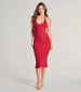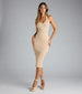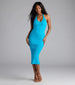 A sleeveless midi dress designed to highlight your curves featuring a flattering halter V-neckline. bodycon silhouette. and a flirty center back slit for movement. Complete the look with earrings and booties.