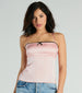 Get ready for a playful night out in this satin cami tank top. With a square neckline featuring delicate trim and a sweet bow. spaghetti straps for a flirty look. and a lace-up back with a center slit for added allure. you'll feel confident and cute all in one! Complete the look in high-rise skinny pants and heels.