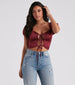 Let everyone take a peek at your cuteness! Dress up your favorite denim in this satin crop top featuring short puff sleeves. a scoop neck. a ruched bust. dual tie-fronts with cutouts. and a fitted hem. The silky satin fabric offers a minimal stretch. Style with boyfriend jeans to complete the look!