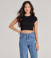 A rib knit crop top features classic cap sleeves. a crew neckline. and a strappy tie back design meant to turn heads. Style with your favorite denim bottoms.