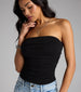 Show off the cutest vibe in this trendy tube top with ruching down the sides for a flattering silhouette. Perf for styling with your fave pair of denim!