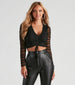 You'll be the cutie in the room in this mesh crop top featuring puff sheer long sleeves. a v-neckline. a front center ruched drawcord with tie closure. and a mesh overlay. Complete the look in dark wash skinny jeans.