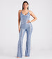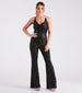 This sparkling sequin jumpsuit is worthy of a dance floor diva like you! It features a sleeveless cowl neckline. halter spaghetti straps. an alluring backless design. a high waist seam. a hip-hugging fit. a form-hugging fit throughout the leg. and a fab flared hem. The mesh fabric features all-over sequin embroidery for a gorgeous shine under the lights. Style with rhinestone fringe earrings and platform heels.Â