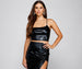 Dare to go bold with a crop top that is so dangerously glam! The crop top features a one-shoulder neckline. a spaghetti strap. and a cropped hem. The top is composed of a lined faux leather fabric that offers a form hugging fit with a slight stretch. Complete look with the matching midi skirt.