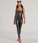 Dare to allure in this sleek faux leather catsuit featuring a sleeveless square neck and back design. thin tank shoulder straps. front hook-eye closures for a secure fit. and a form-hugging silhouette. Style with stiletto heels.