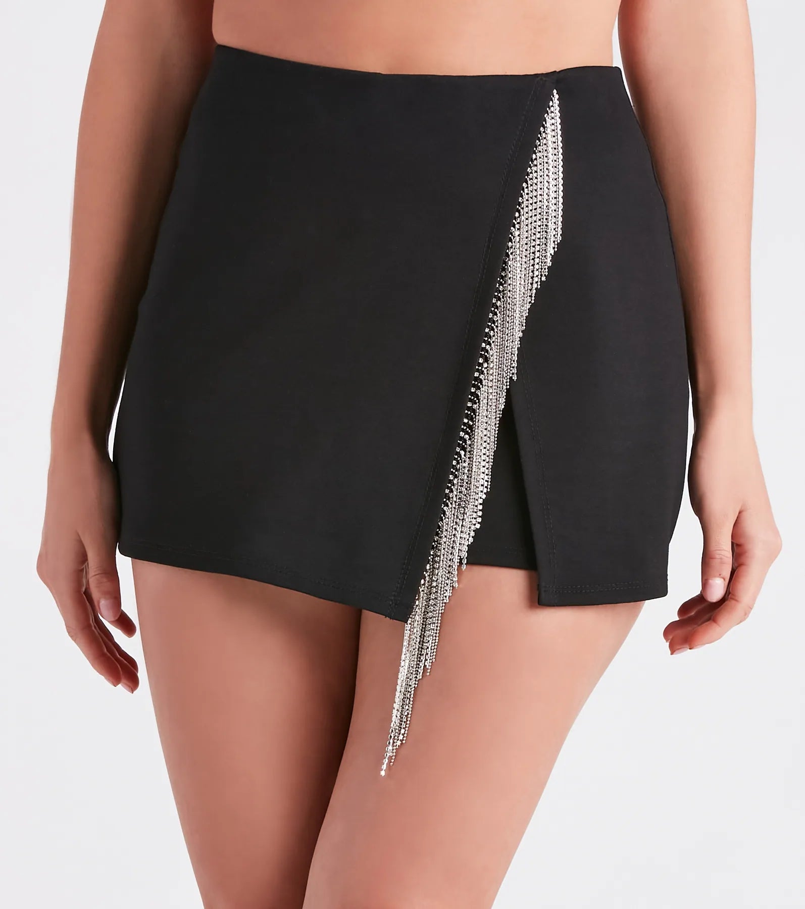Dare to dazzle in this ponte skort from dusk to dawn! It features a flattering high-rise elasticized waist. a front-side rhinestone fringe trim along a split design. and a short form-hugging fit. Complete the look in a bustier bodysuit for a night on the town!