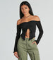 Day to day. this off-the-shoulder crop top just gets cuter! It features fitted long sleeves with lettuce trim. a front adjustable drawstring lets you customize the style. and a slit accent along the lettuce trim hem on stretchy rib knit fabric. Complete the look with high-rise jeans for casual weekend plans!