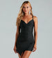 Have yourself a dazzling night out in this sultry mini dress! Adorned with rhinestone-embellished straps. this dress features a sleeveless surplice V-neckline. a side pleated seam. and a flattering bodycon silhouette and wrap hem. Complete the look in rhinestone earrings and heels.