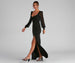Make a head-turning impression with a formal dress that wows from the moment you enter the room! Delanie features a plunging V-neckline. long chiffon sleeves with a swiss dot pattern. and the back features a daring open-back design. Her high-rise waist leads to a mermaid silhouette that is accented with a daring high side slit. Complete your formal outfit with rhinestone heels and a clutch.Â