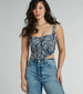 Bring delight and allure in this must-have sleeveless corset top to elevate your seasonal style! Perfect for making a statement. this top features a square neckline and hidden front closures to give a flattering silhouette. while the jacquard tapestry woven fabric adds texture and uniqueness. The angled cropped hem and form-hugging fit will create that iconic snatched look. Style with new denim jeans.