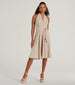 Step out looking delightful in this charming sleeveless midi dress for parties or showers! The halter pleated neckline and open back add a flirty touch. while the beaded tie waist cinches your waist for a flattering A-line silhouette. Complete the look with sunglasses and sandals!