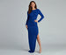 Create a head-turning formal look in the illuminating Denise glitter knit dress. She features a high crew neckline. long fitted sleeves. an asymmetrical back cutout. ruching down one side leading to a thigh-high slit. and a floor-length. fitted silhouette. Style this dress with sparkling rhinestone earrings and heels.