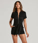 Designed to be your new favorite done in one piece. this denim romper offers a cute and flattering style year-round! It's designed with classic short sleeves and collar neckline. a zip-front closure. two flap pockets and side pockets for convenience. a tie-waist belt that cinches your waistline. and a form-hugging fit. Complete the look with sleek hoop earrings and your fave sneakers!