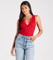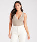 A sweater knit bodysuit for those days when you wanna take your outfit down a notch. It features a sleeveless crew neck with a front-notch accent. a form-hugging fit. and a thong bottom with dual snap-button closures. Complete the look in trendy dad jeans.