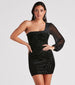 Make your next dressy occasion a dramatic affair in this luxe velvet mini dress! It features a one-shoulder neckline with a sheer mesh long balloon sleeve. a chic velvet burnout scroll pattern down the body of the dress. and a mini-length bodycon silhouette. The lined knit fabric offers a moderate stretch. Complete the look with rhinestone hoops and strappy heels.