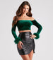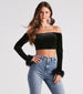 Look like a dream in this velvet crop top perfect for dressing up your favorite jeans or skirt! It features an off-the-shoulder neckline and long sleeves with marabou feather cuffs. Complete the look with best-selling bottoms and heels.