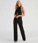 Let this sultry jumpsuit do the talking! Dress to impress in this sleeveless texture knit jumpsuit featuring a halter mock neck. open-back. front keyhole cutout. and a wide-leg silhouette. Complete the look with rhinestone hoop earrings.