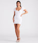 The perfect eyelet lace mini dress for sunny days! It features adorable puff short sleeves. a sweetheart neckline. a front bust ruched drawstring. and a bodycon silhouette. The eyelet lace fabric includes a knit lining and offers moderate stretch. Complete the look in this mini dress with cute sandals.