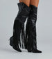 Give off edgy country babe vibes in these sleek fringe western boots! They feature a knee-high height with pull tabs on each side for easy wear. a back zipper closure. small studded-embellished trims. a flowy fringe all-around design. a pointed toe. and a low block heel. The western-style boots are composed of a faux leather material. Pair with a corset top and a mini skirt for a cute bar look!