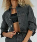 Enter your edgy era with this rocker-glam rhinestone denim jacket! The structured denim fabric is embellished with mini rhinestones down the front and sleeves for a trendy shine. The jacket features a collared neckline. long sleeves with buttons to cuff. a button-down front. chest pockets. and a cropped hem with a relaxed fit. Complete the look with the matching mini skirt and combat boots for a concert!
