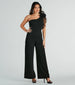 A one-shoulder crepe jumpsuit that makes you look like you've stepped out of the pages of a fashion magazine! It features a sleeveless design with a chic organza ruffled shoulder strap. a fitted bodice. and a flattering wide-leg silhouette on crepe knit fabric. Complete the look in stiletto heels for a dinner party or dressy occasion!