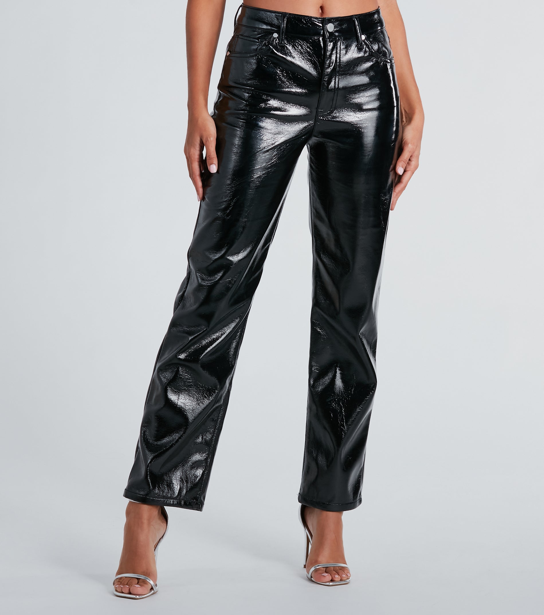 These patent faux leather pants will add an effortless edge to your going-out looks! They feature a high-rise waist. an on-trend straight-leg silhouette. and a five-pocket and belt loop design. The patent faux leather fabric features a crinkled texture for a cool vibe. Style these pants with a smooth knit bodysuit and ankle booties for your next night out bar-hopping!