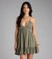You'll love the effortlessly pretty look this flowy skater dress brings to your summer plans. It features a V-neckline. an open cross-back design. and a babydoll skater silhouette with a short ruffled hem.