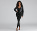Keep it effortlessly chic with a catsuit that enhances curves in all the right places. The catsuit features a sleeveless scoop neckline. a zippered front with a mini O-ring. adjustable spaghetti straps. and skinny-fit pants. The catsuit is composed of a ribbed knit fabric that offers a form hugging fit with a moderate stretch. Complete look with stiletto boots and a moto jacket.